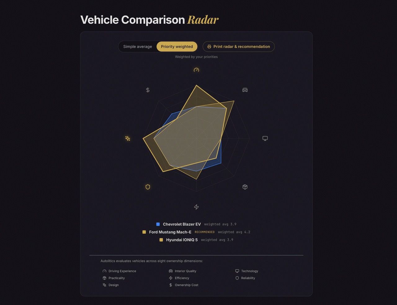The goal was not to create another source of opinions, or another set of rankings, but to introduce structure into the decision itself. To make it possible for someone to move from a broad set of impressions to a clear understanding of which vehicle actually fits their needs, and why—without requiring them to develop deep domain expertise along the way.