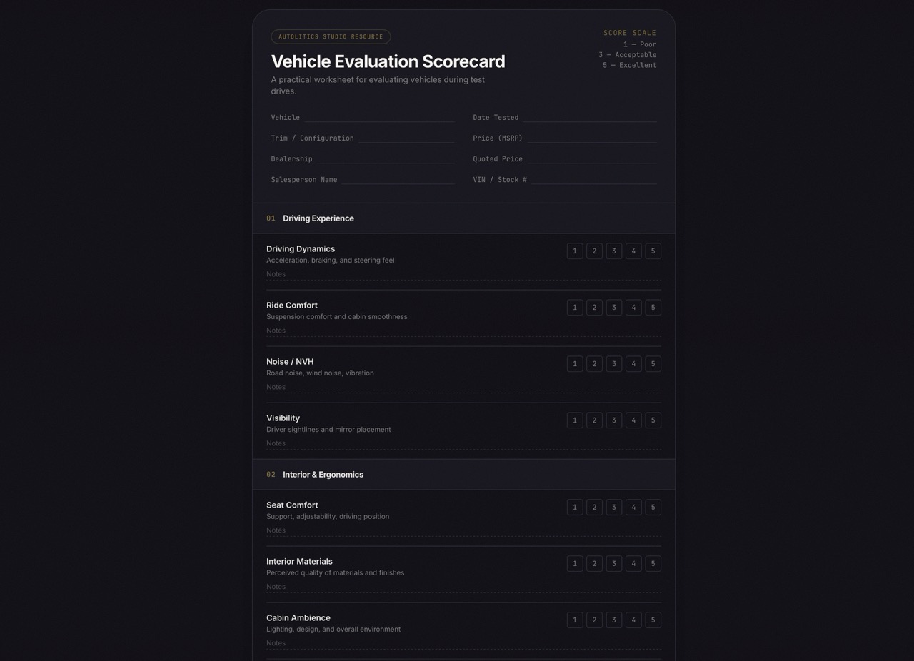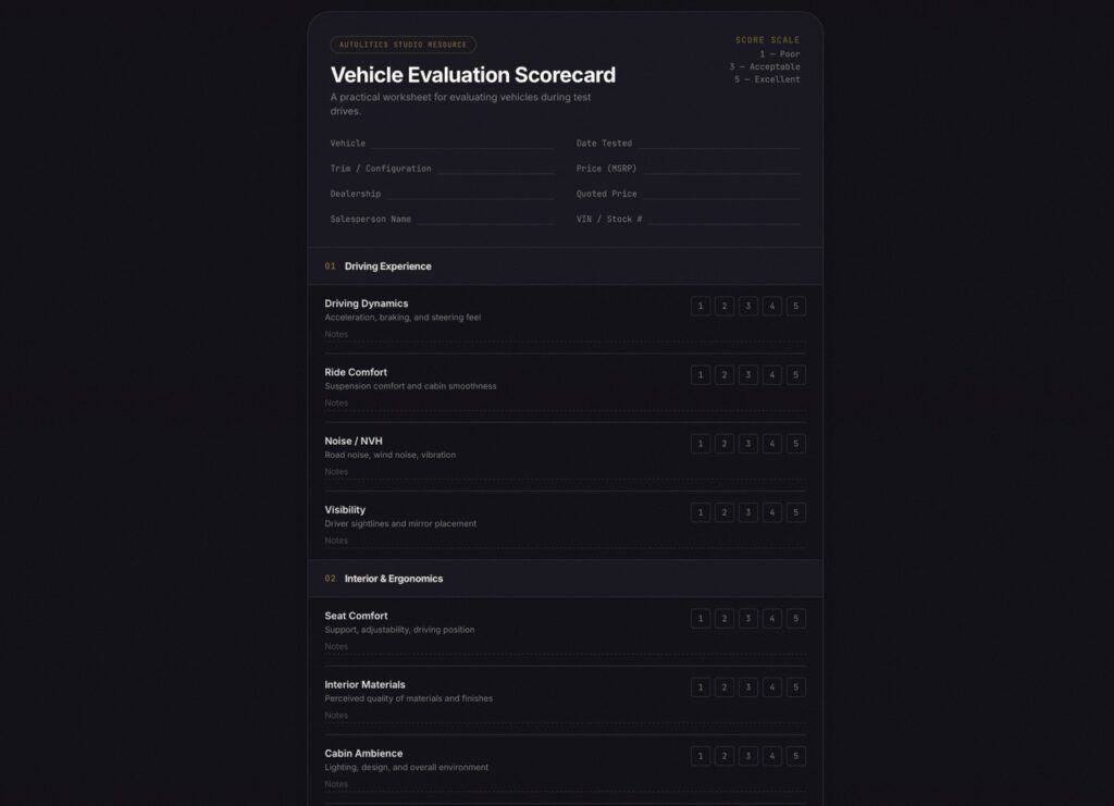 Similarly, the evaluation process itself is structured so that test drives become more than quick impressions. Instead of trying to remember how each car felt in isolation, you capture observations in a way that can be compared later—when the differences actually matter.